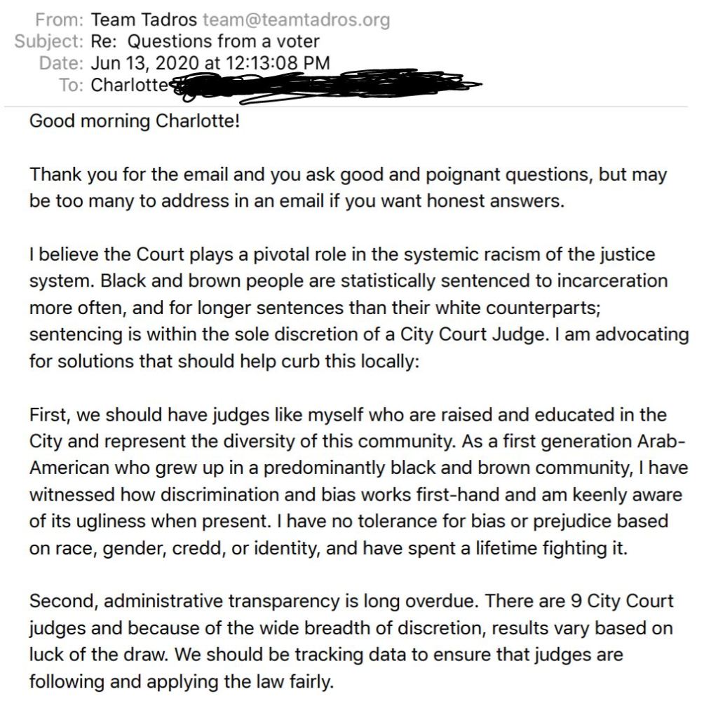 My approach was to contact all 4 of the democratic hopefuls on the ballot (Limpert, Tadros, Pitts-Davis, and Leibo) with the same short email and questions, and compare their responses.